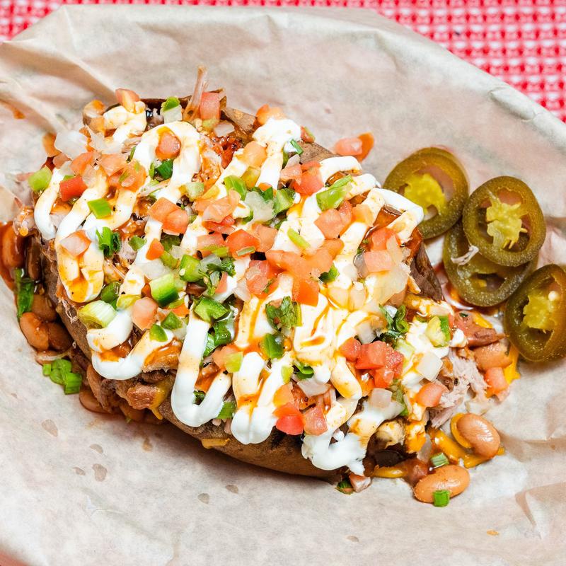 Smothered in butter, or your choice of Brisket or Pulled Pork, Cheddar Cheese, and Sour Cream | Plain $9 / Loaded $13