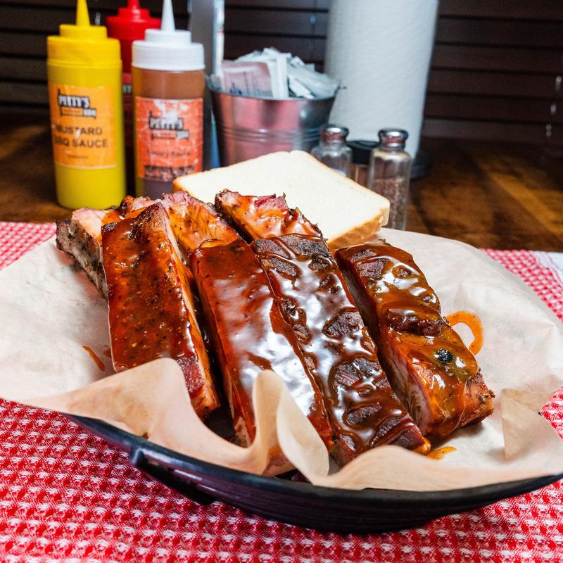 Petty's BBQ logo top - HomepagePetty's BBQ logo scroll - Homepage
