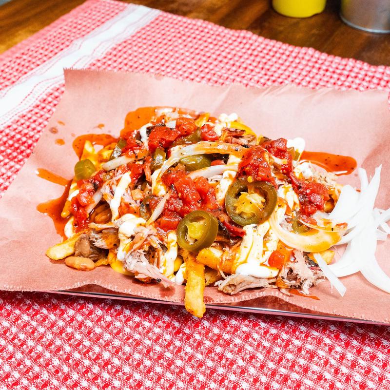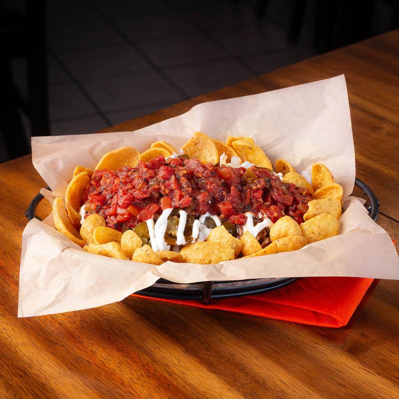 Nacho Cheese, Choice of Meat. Sour Cream/Jalapenos/Onions/Salsa/Pinto Beans/BBQ Sauce | Plate $12 extra meat +$7